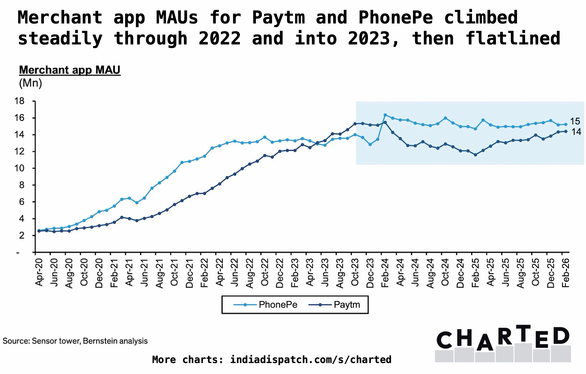 Monthly active users on merchant apps for Paytm and PhonePe have stagnated since late 2023, sitting at roughly 14 million and 15 million respectively, even as their combined registered merchant base reached ~47 million and is still growing at 10–15% annually.