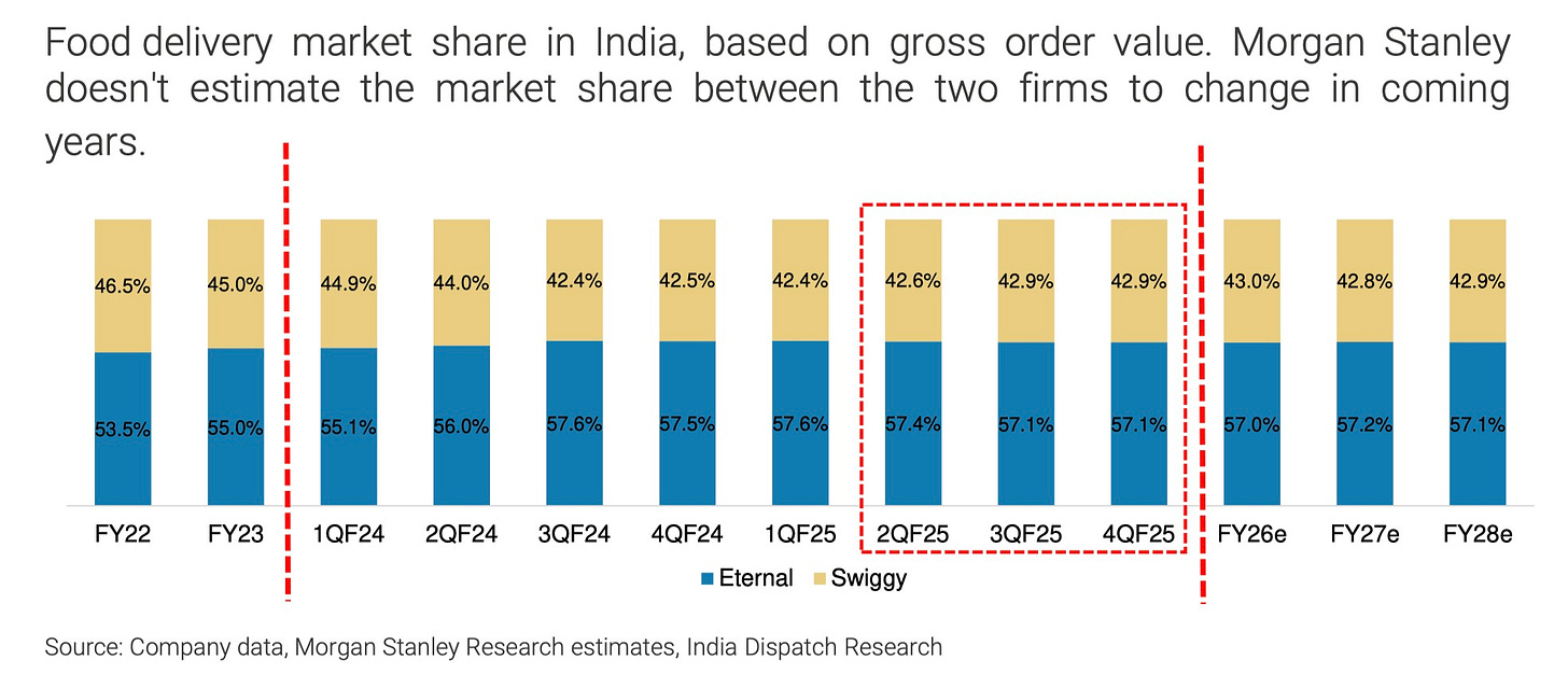 So just last week, I made a case for why I believe that India's food-delivery market, currently a duopoly between Zomato (Eternal) and Swiggy, is unlikely to see any material competition from a third player.