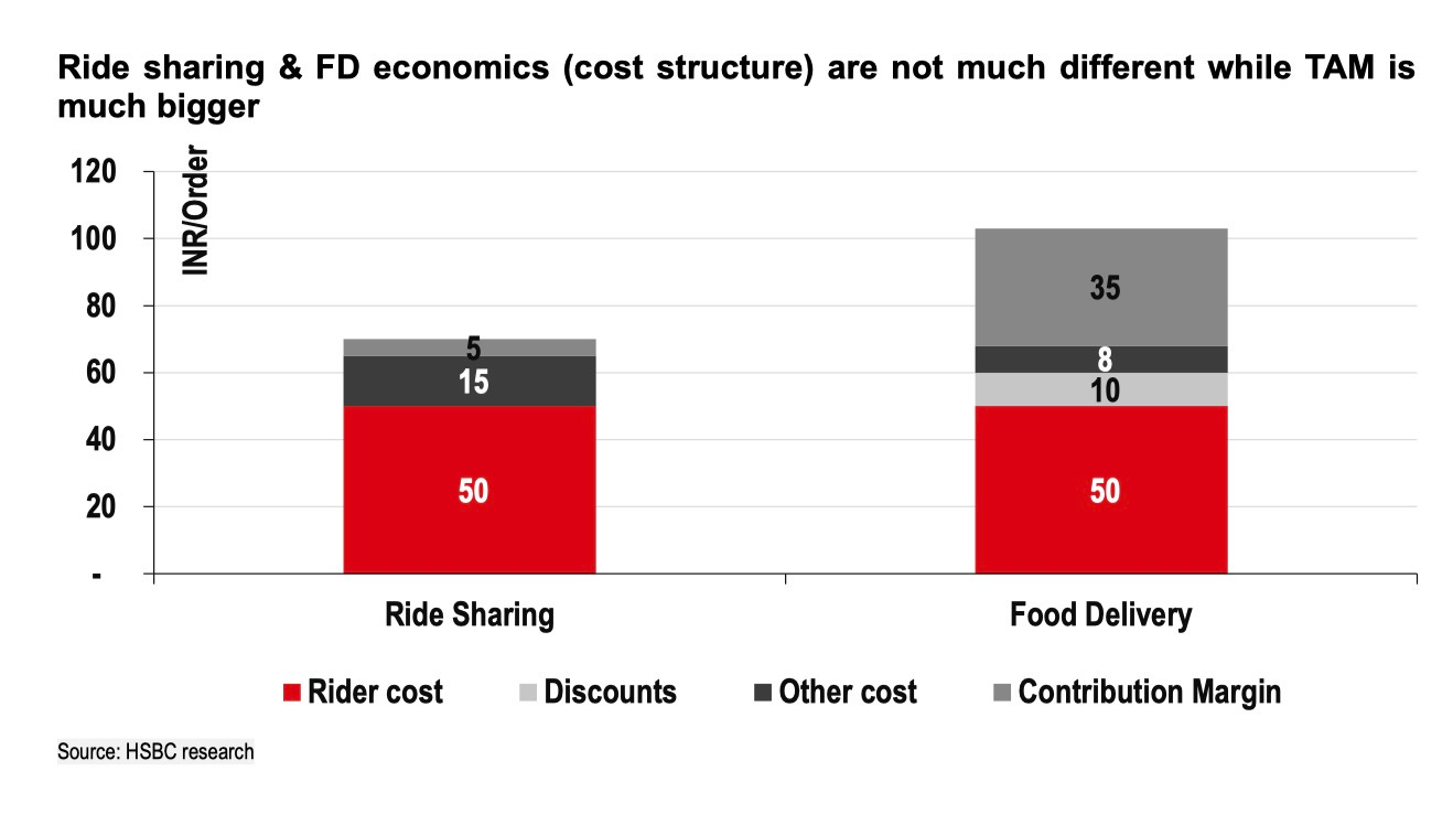 The average two-wheeler ride-sharing cost economics are remarkably similar to those of food delivery, HSBC said in a note Wednesday. The average order value for a two-wheeler ride is around 70 rupees (82 cents), with total variable costs hitting about 65 rupees when you factor in rider costs, discounts, and other operational expenses. That leaves a contribution margin of just 3-4 rupees per ride.
