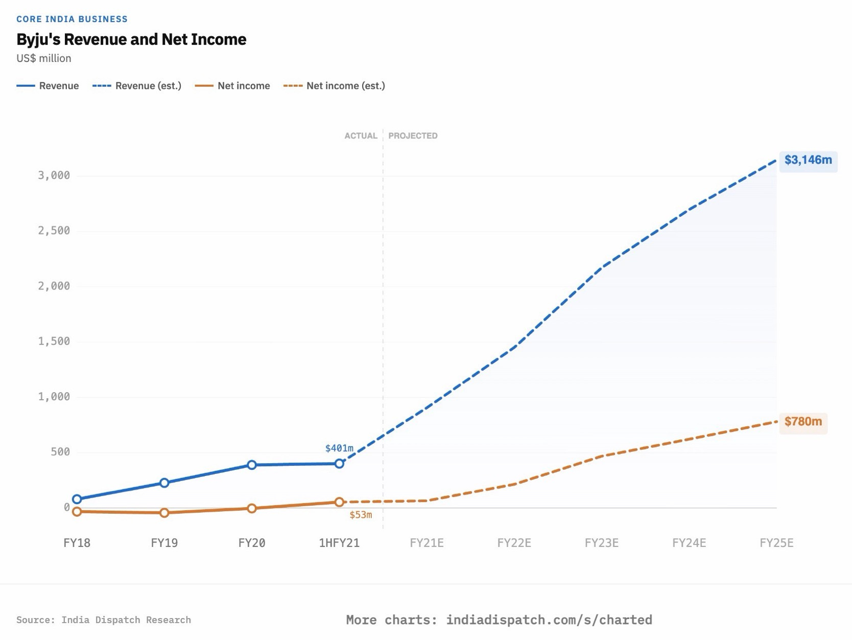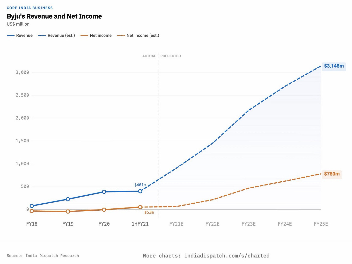 Byju’s, once the most valuable startup in India, had projected hitting $3.1 billion in revenue and $780 million in net income for its core India business by FY25, according to internal documents reviewed by India Dispatch.