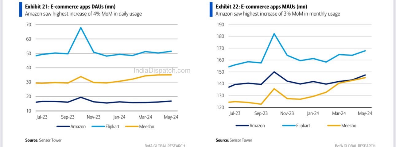 Flipkart continues to outpace Amazon in India in daily active users, despite Amazon’s rep as the ruling rajah among metropolitan shoppers. Interesting charts, via Bank of America:
