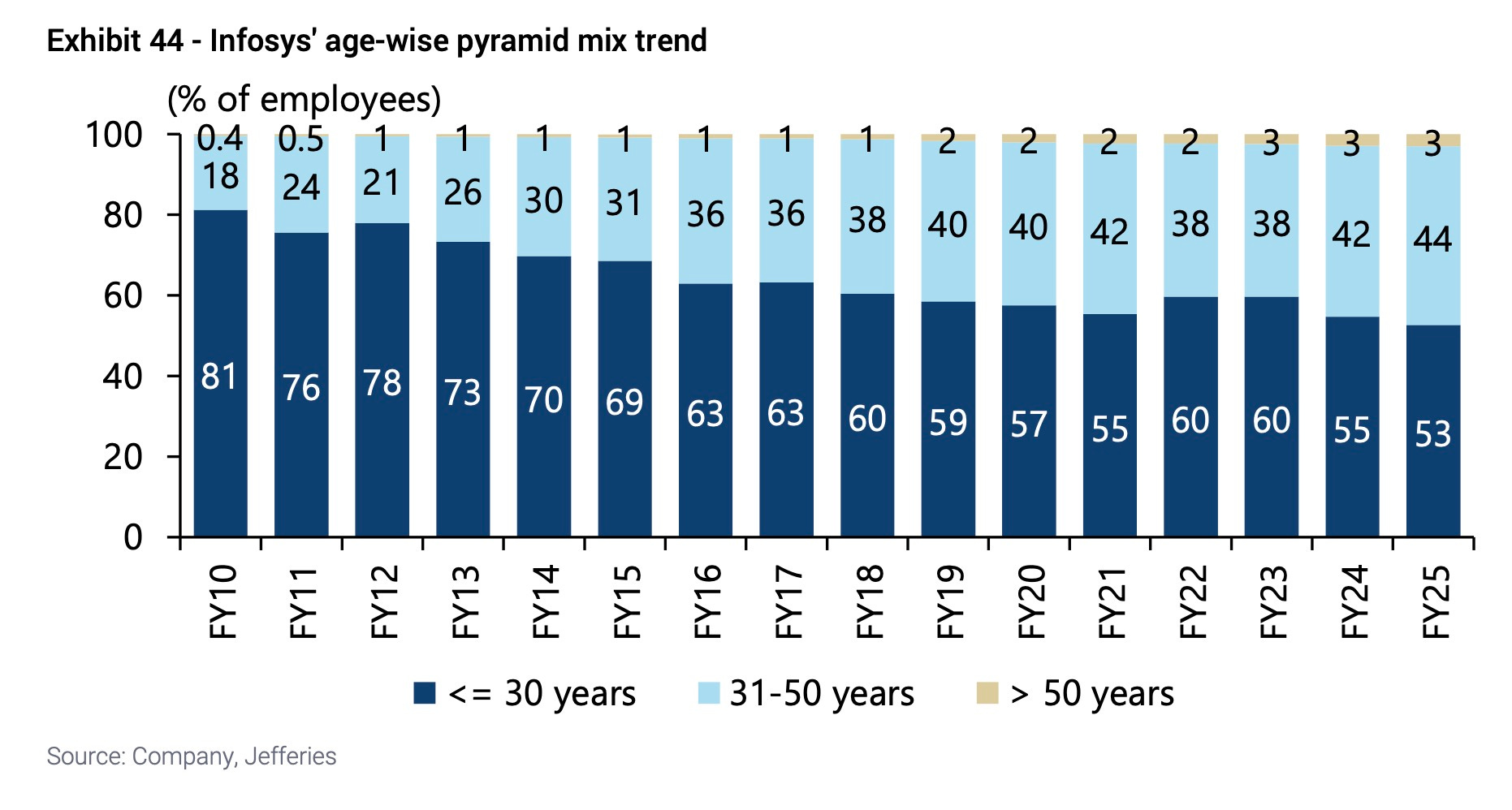 This collapse in junior hiring is accelerating a demographic transformation that has been underway for over a decade, fundamentally altering the age profile of the industry’s workforce. The share of staff under 30 at Infosys plummeted from 81% in 2010 to a projected 53% by fiscal 2025, according to an analysis by Jefferies. Baselines may vary, but the overarching story is consistent: the proportion of junior employees has contracted by roughly one-third in fifteen years.