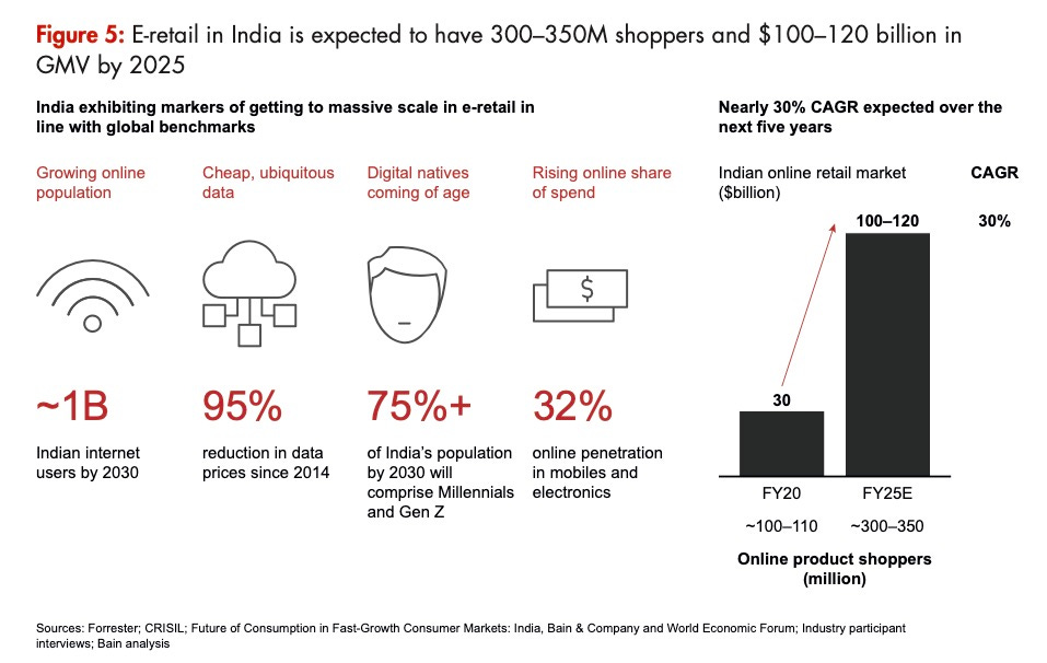 The Indian e-retail market is primed to reach nearly 300 to 350 million shoppers over the next five years—propelling the online Gross Merchandise Value (GMV) to $100 to 120 billion by 2025.