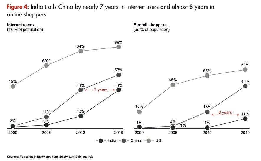 The intellectual foundation of the series is a comparison to China. In 2020, Bain argued that India’s e-retail market looked a lot like China’s had about eight years earlier — before Alibaba and JD.com and cheap smartphones turned it into the world’s largest online shopping market. Data prices in India had just crashed in the same way. Internet users were multiplying rapidly. So the analogy was not unreasonable.