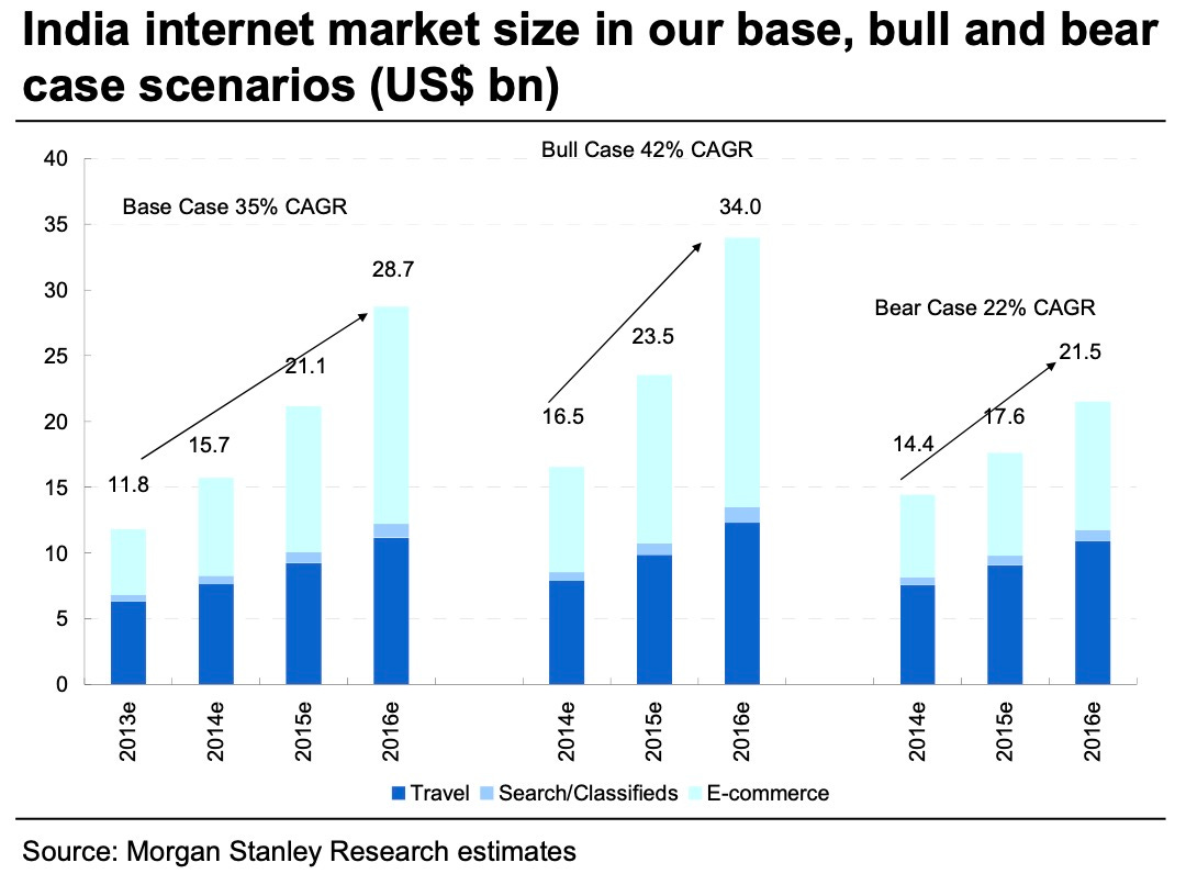 Eventually, reality intrudes. By 2014 the narrative had transitioned from connectivity to digital commerce. A Morgan Stanley internet blueprint forecast India’s e-commerce market would compound at 50% annually. Nomura’s analysts, reaching the apotheosis of analogy, declared that India in 2014 was “like the US in the mid-90s,” as if a nation with hundreds of millions in poverty could be mapped onto Silicon Valley’s suburban boom.
