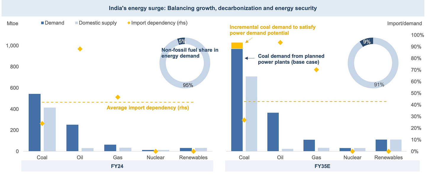 Assessments suggest India may need roughly 140 gigawatts of additional coal capacity by fiscal year 2035 versus 2023 levels. The government’s current target is roughly 87 gigawatts by fiscal year 2032. Some of this coal is bridge capacity to stabilise a faster-greening grid, not a repudiation of renewables, but the scale required exceeds what policymakers have publicly acknowledged or what most analysts expected even two years ago.