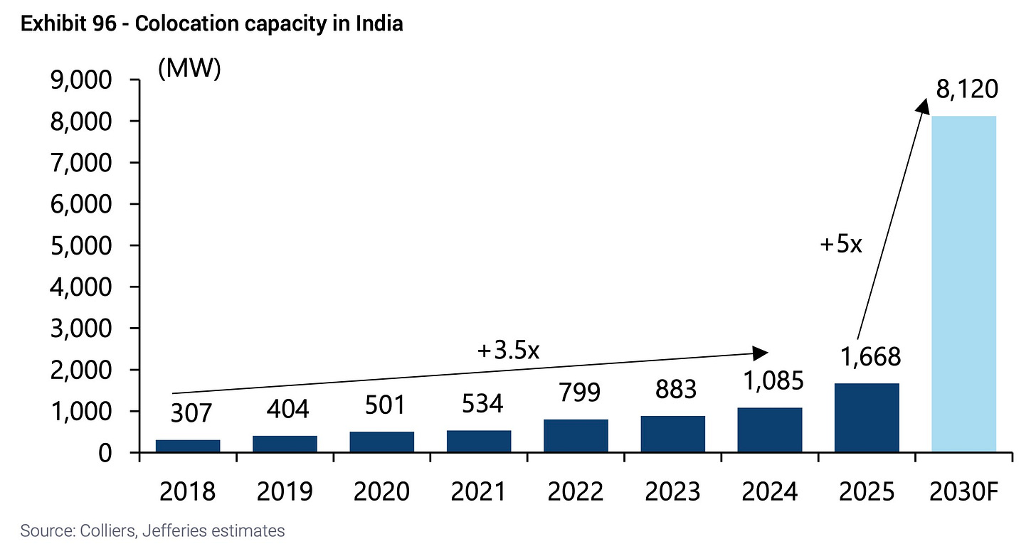 India’s data-centre base is still in the low single-gigawatts today, but Bernstein forecasts cluster around 5 to 6 gigawatts by 2030, provided interconnects and land clear on time. Jefferies’ top-end view reaches roughly 8 gigawatts, which at typical costs of 4 to 5 million dollars per megawatt implies 32 to 40 billion dollars of capital expenditure by decade-end.