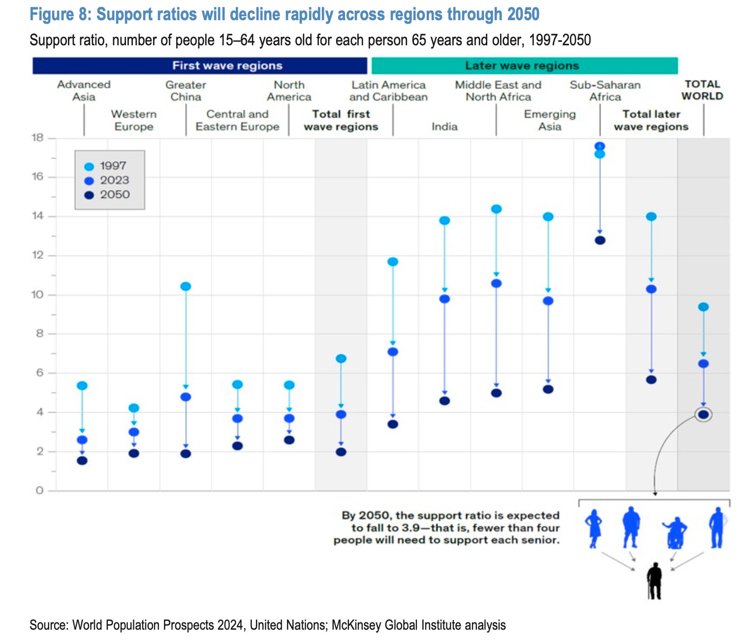 China’s compressed dilemma mirrors what is gripping the developed world, where Europe’s share of population over 65 is on track to hit 30% by 2050, up from 8% in 1950. Raising retirement ages — what economists describe as the closest thing to a silver bullet — faces older voting blocs, who now make up roughly 40% of those who turn up at the polls in European elections. In the U.S., what J.P. Morgan analysts term a “Social Security cliff” looms by 2033, when the system’s trust funds are projected to be exhausted, and hopes that productivity miracles (powered by, hopefully AI) will quietly square this circle look optimistic, leaving much of the rich world and North Asia out of time.