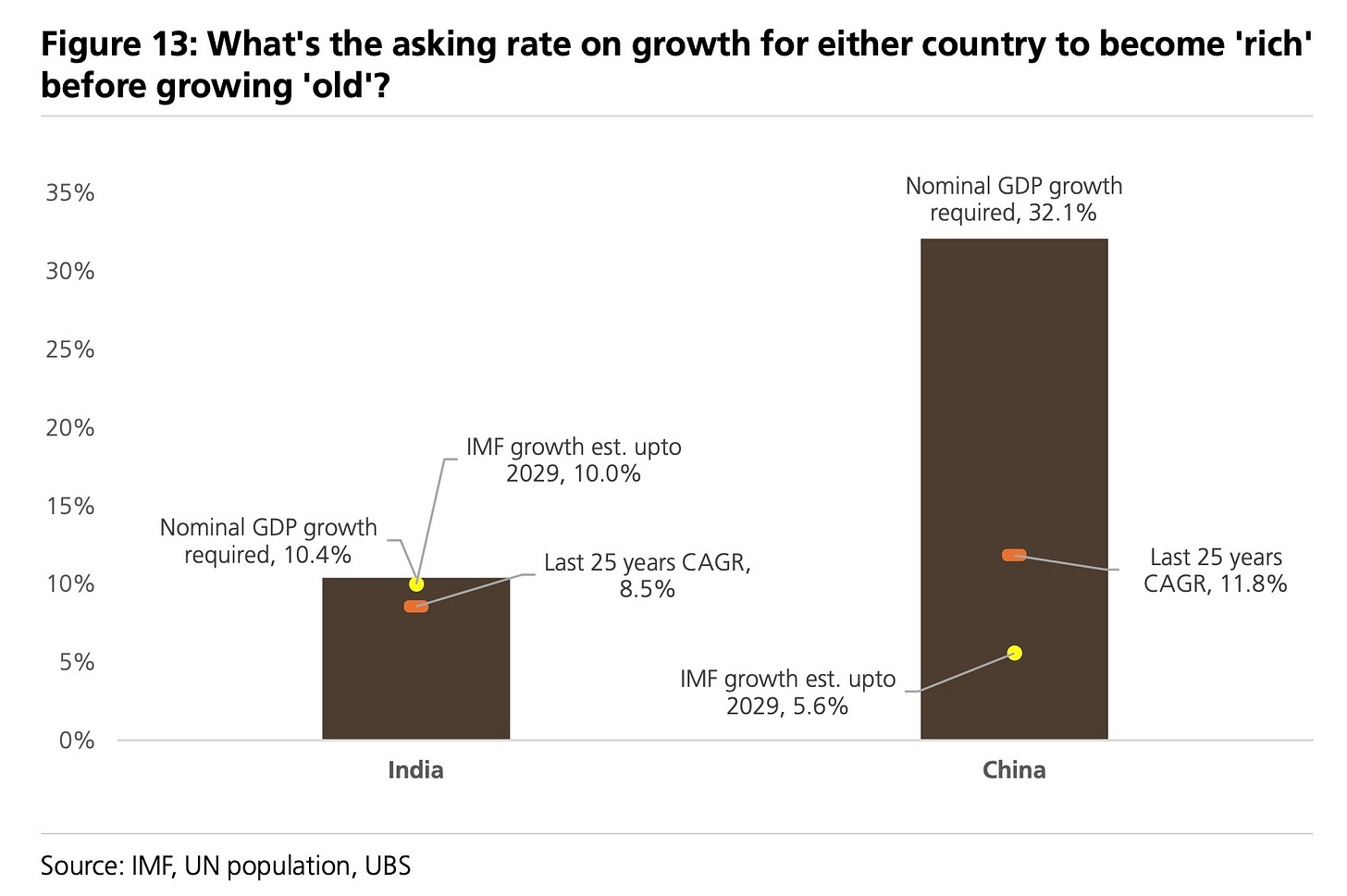 To become rich before it finishes growing old, China would now need a breathless sprint of 32% annual GDP growth, while India faces a gruelling marathon, requiring a more plausible, though still demanding, 10.4% sustained growth rate over 35 years.