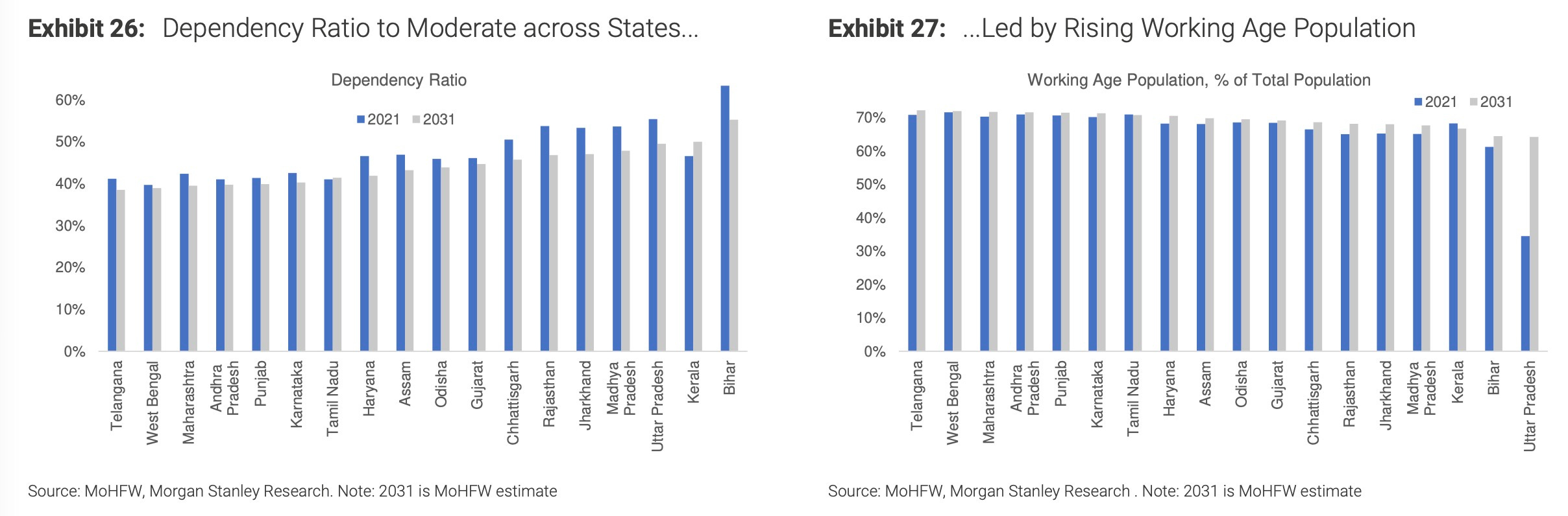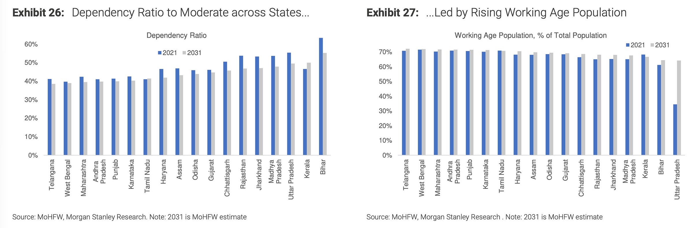India’s working-age population is set to rise from 67.5% in 2021 to 69.2% by 2031, while the total dependency ratio — the number of children and retirees each worker must support — is projected to fall from 48.2% to 44.1%, with the median age nationwide projected to be just 34.5 in 2036, keeping a youth bulge flowing through the labour market for years to come.