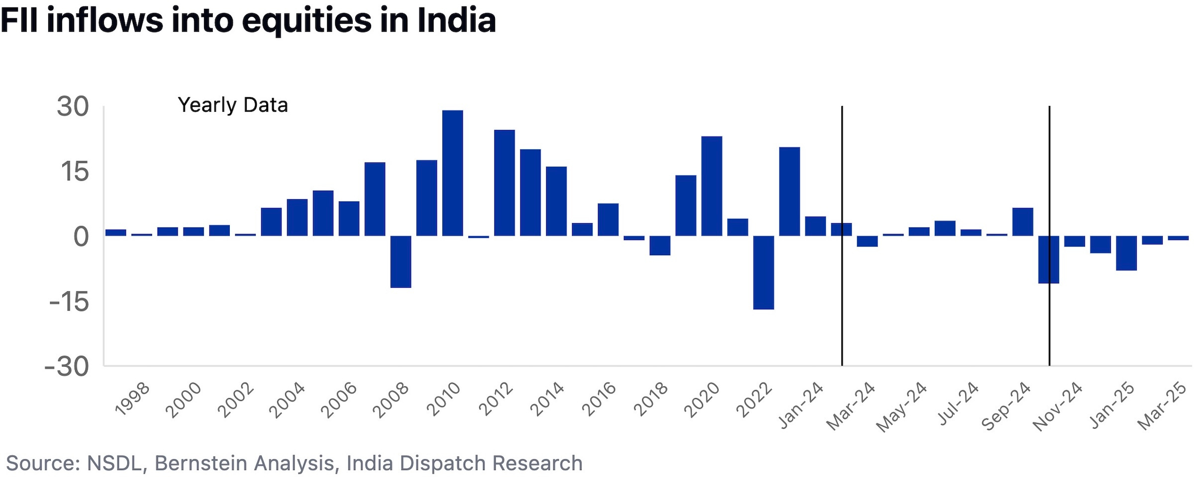 Foreign institutional investors have flipped from heavily overweight to underweight on India in a matter of months, revealing the market’s tendency to construct elaborate narratives to justify investment decisions rather than letting fundamentals drive market sentiment.