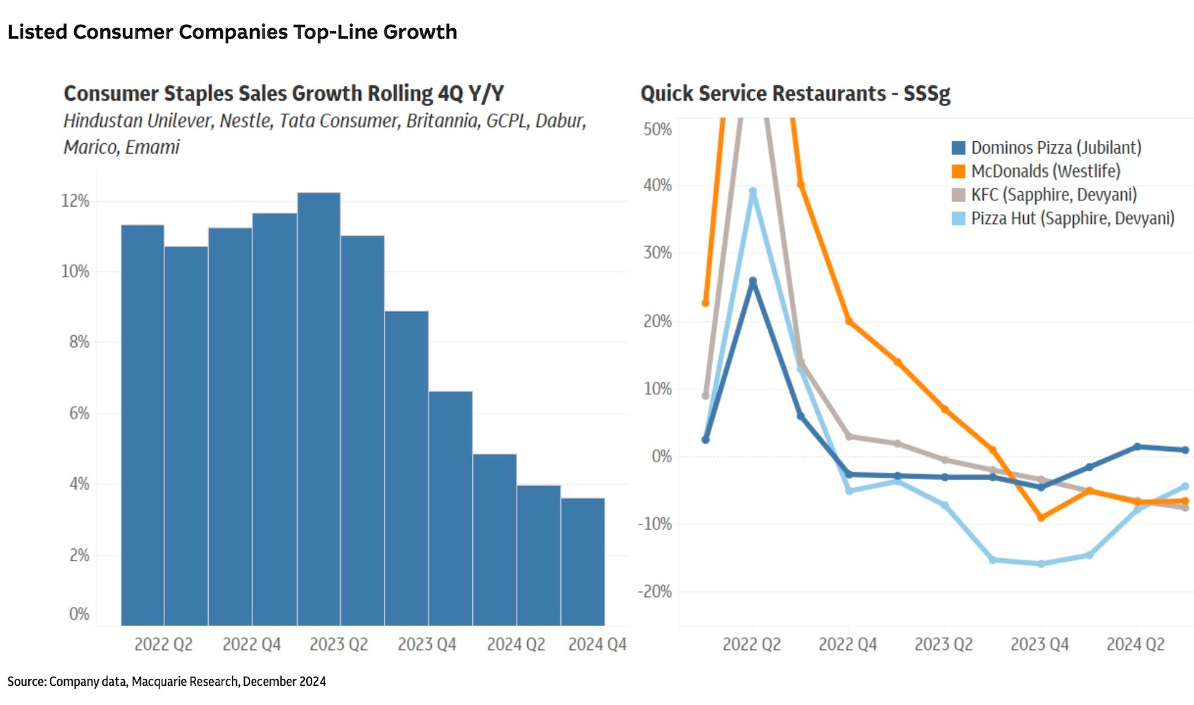 Consumer staples sales growth for major listed companies including Hindustan Unilever, Nestle, and Britannia has fallen below 4% on a rolling four-quarter basis. Quick-service restaurants are reporting negative same-store sales growth, affecting major chains including Dominos Pizza (Jubilant), McDonalds (Westlife), and KFC.