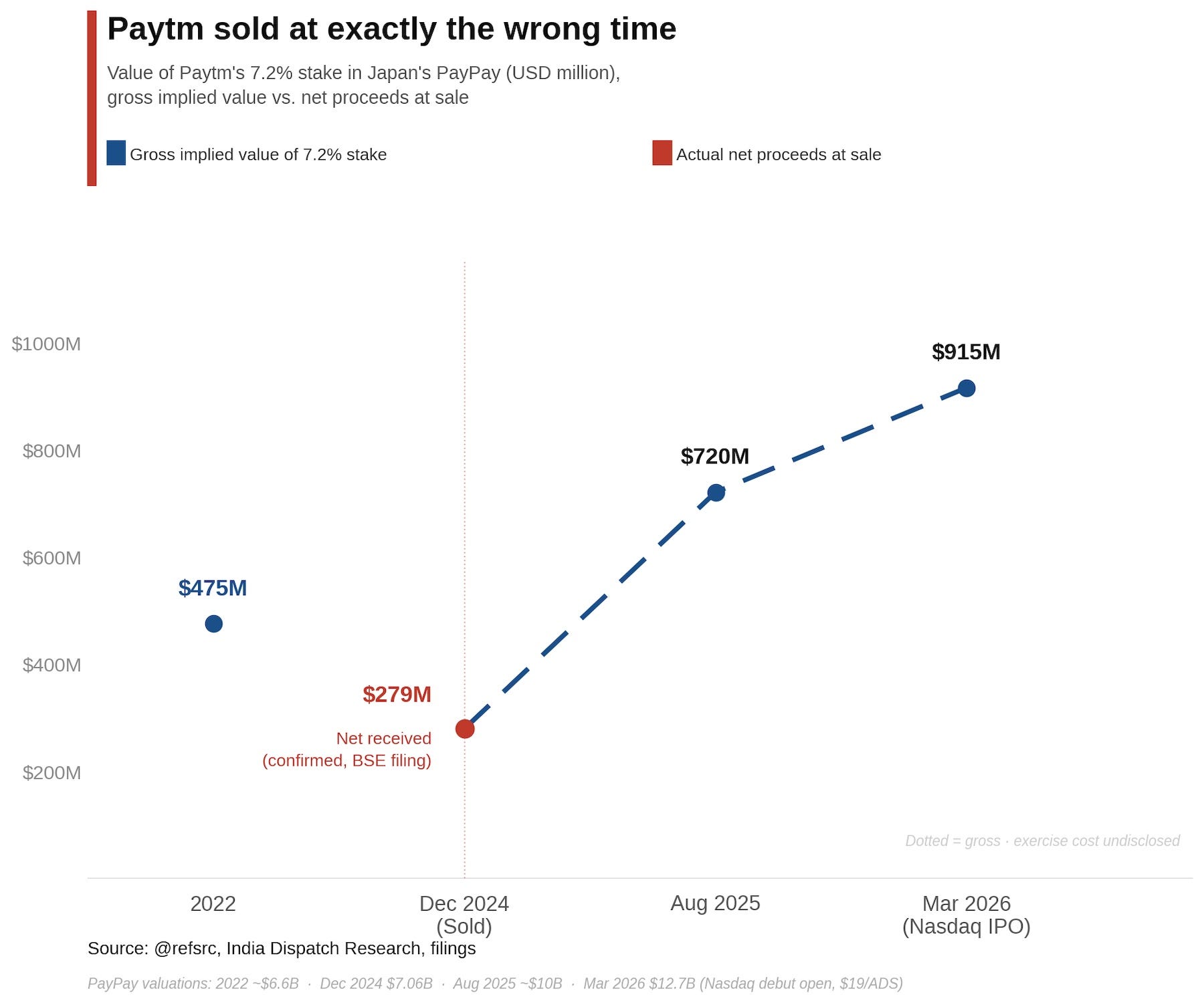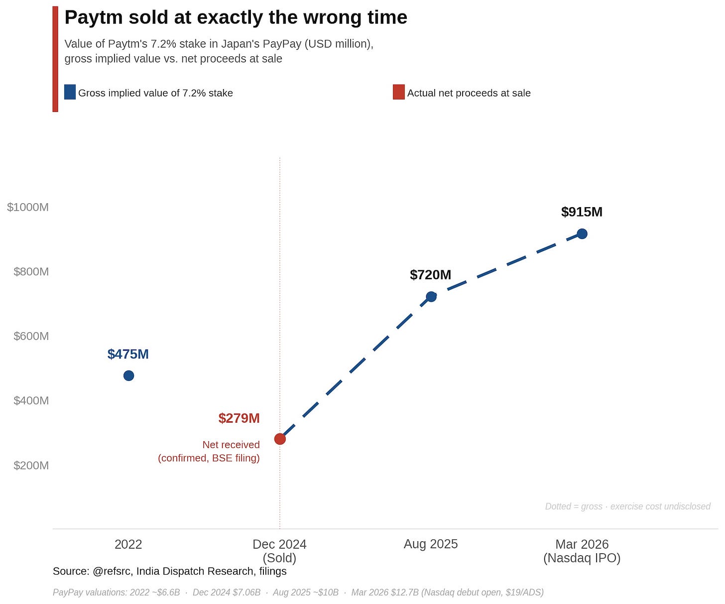 Paytm held the stake not as equity but as Stock Acquisition Rights, and had to pay an exercise cost to convert those rights into actual shares before selling them, which reduced its net proceeds. The transaction valued PayPay at $7.06B (PDF). Fifteen months later, PayPay debuted on the Nasdaq at an opening market cap of $12.7B, putting the gross implied value of the same stake at $915M.