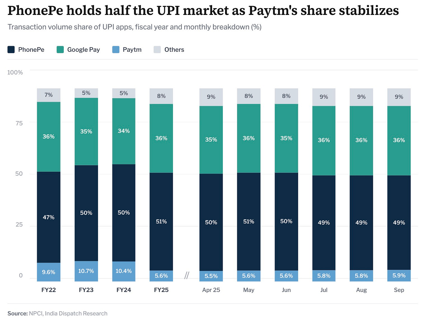 PhonePe built India’s largest payments platform on government rails, under rules it cannot set, funded by programmes that require government subsidy. Paytm — which suffered from regulatory blows and directions, including government’s push to make UPI ubiquitous at the expense of mobile wallets — reached profitability under the same rules and is trading at half of PhonePe’s supposed ask.