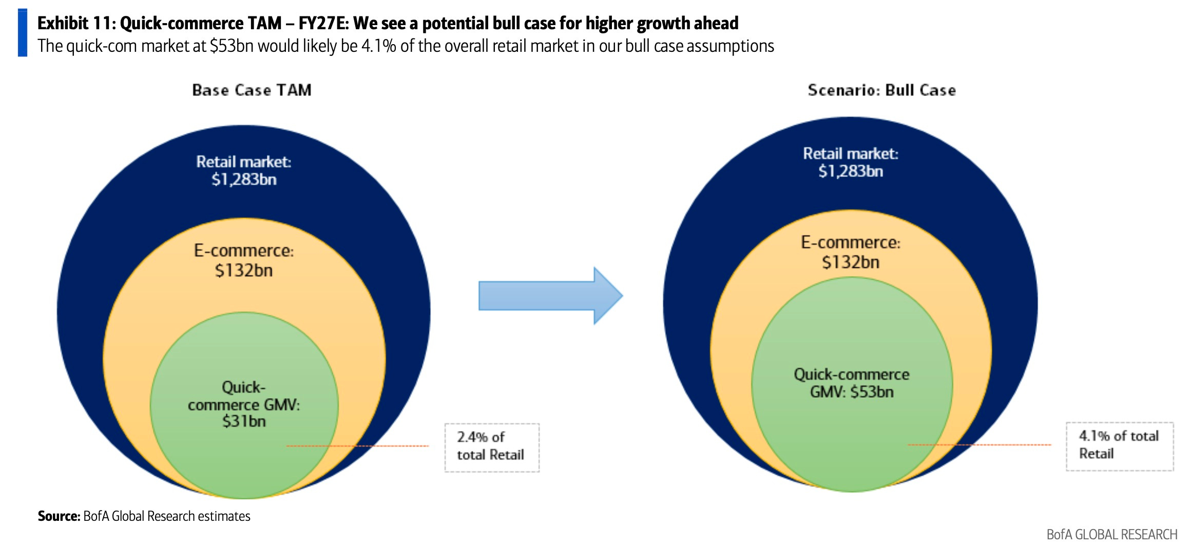 India’s densification is happening both in top metros and in tail cities, raising service levels without breaking delivery costs. Blinkit is leading the expansion while Zepto and Instamart have slowed store openings, allowing their older locations to mature and improve contribution margins. Competition has already cooled at the edges as Zepto and Instamart balance growth with EBITDA and as newcomers fail to find a wedge. BofA expects consolidation around two or three national winners. Capacity will still expand fast but the centre of gravity will drift toward procurement, private label and ad yield, a recipe for margin recovery as the category gets bigger.