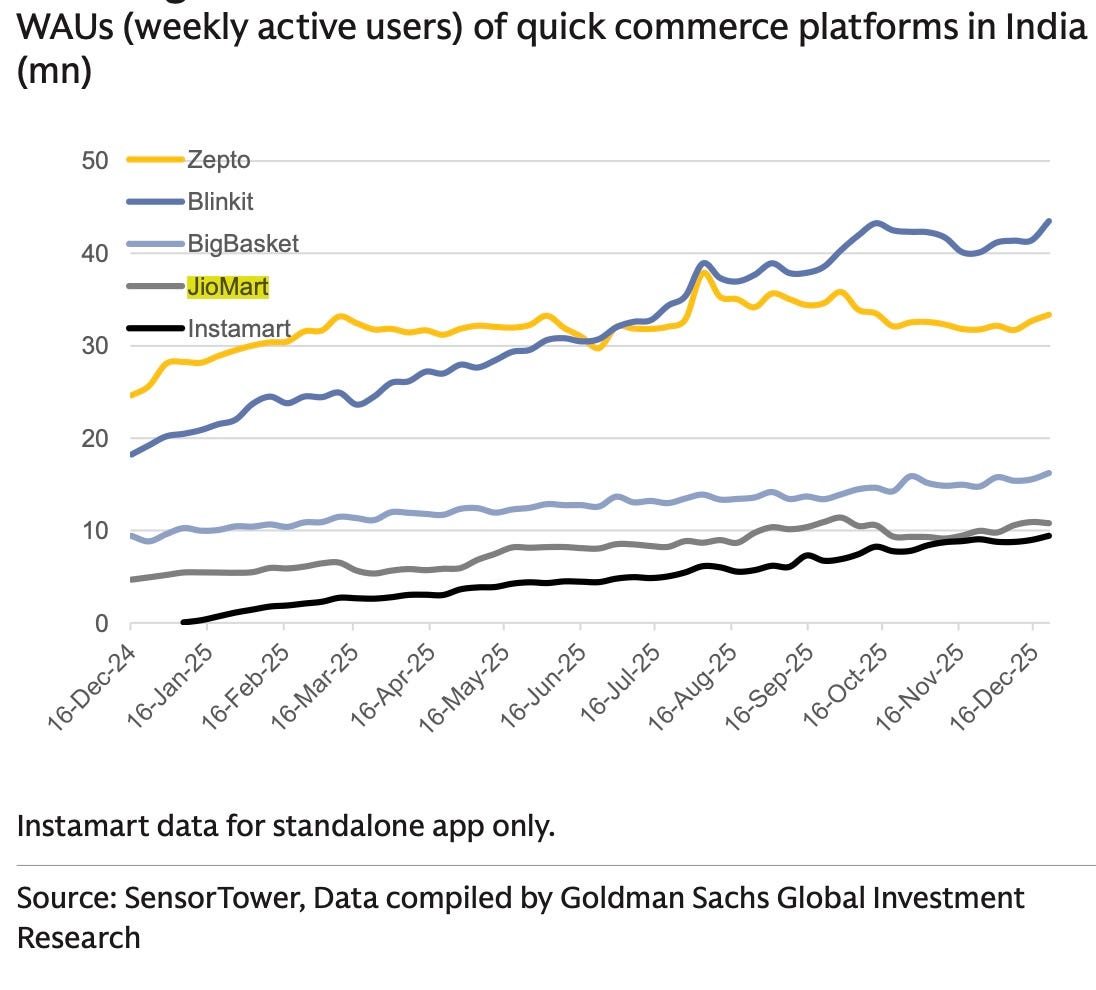 JioMart, in comparison, is far behind Blinkit and Zepto.