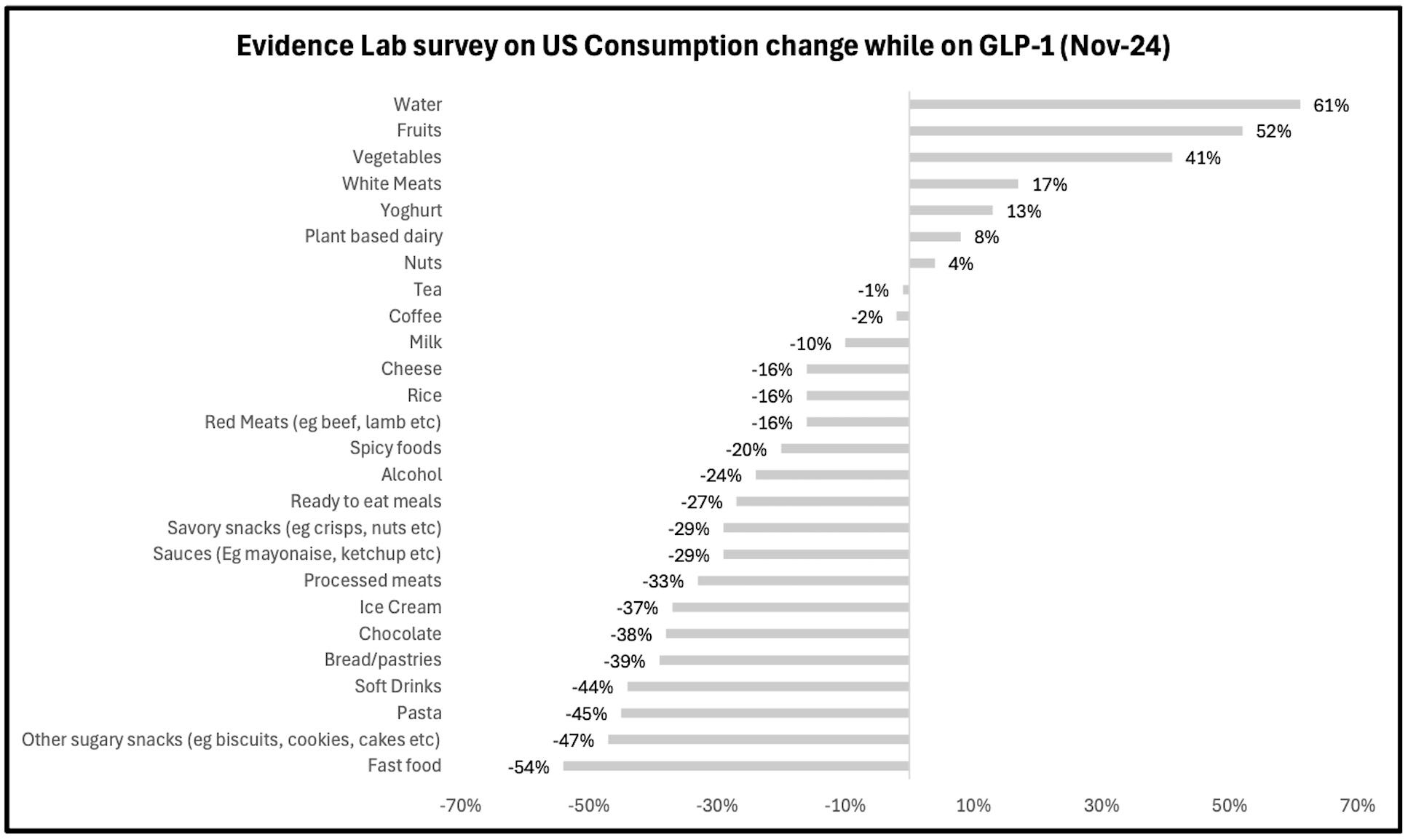 American GLP-1 users cut daily intake between 250 to 800 calories, or a tenth to a third of average adult consumption, concentrating reductions on fast food, sugary snacks, fizzy drinks and alcohol. Households with at least one GLP-1 user reduced grocery spending by 6% within six months of starting the medication, according to research from Cornell University and consumer insights firm Numerator covering 150,000 American households. Higher-income households reduced spending by 8.2%.